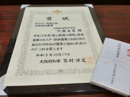 学校の様子(放送集会・表彰)本日放送集会では、秋山先生の後任の米田先生の紹介と美術の「薬と健康の週間」啓発事業ポスター原画の部で大阪府知事賞をいただきましたので表彰をしました。おめでとう。