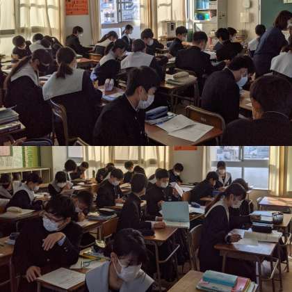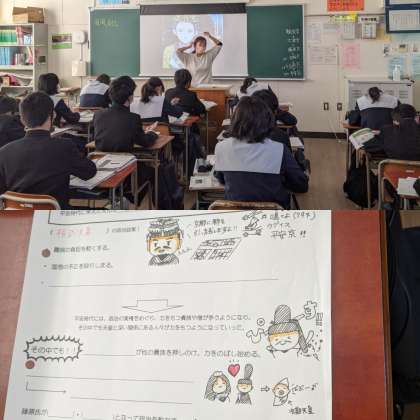 【社会】平安時代に栄えた国風文化について学んでいます。プリントにはかわいいイラストが描いています。(2組)