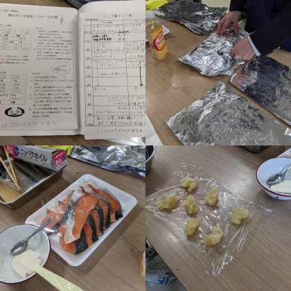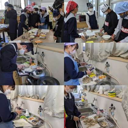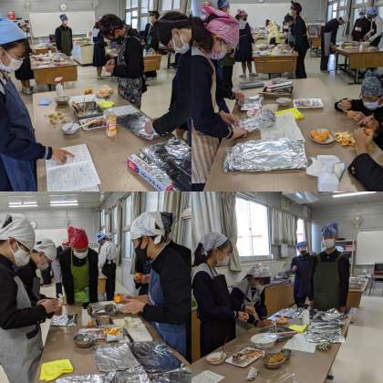 3、4時間目の授業の様子です。調理実習で献立は『魚のホイル焼き』と『フルーツ大福』です。野菜を切る、みかんの皮をむく、アルミホイルに油をぬるなどそれぞれが役割分担して調理していきます。(2年3組)