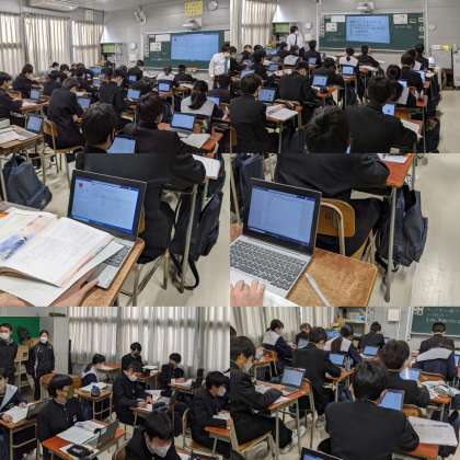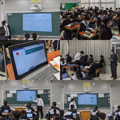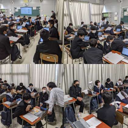 本日、1時間目に2年2組で道徳の研究授業がおこなわれました。教育委員会からも研修担当の先生が来ています。今回のテーマはどうすればよりよい人間関係が築けるのかです。一人一台パソコンを活用して授業が進んでいきます。パソコンに送られてきたアンケートに回答すると、その結果がすぐに反映されてプロジェクターに結果が映し出されます。登場人物に共感できるのか、できないのか。班になって自分の考えを伝え、出てきた考えを発表します。パソコンに1枚のシートが用意されていて、名前が書いてある所に自分の考えを書きます。同じシートに書きこんでいくので、すぐに他の人の考えを見ることができます。