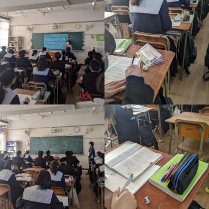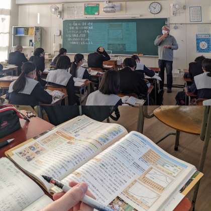 【社会】労働環境の変化と課題について学んでいます。外国人労働者の問題についても触れていました。(1組)