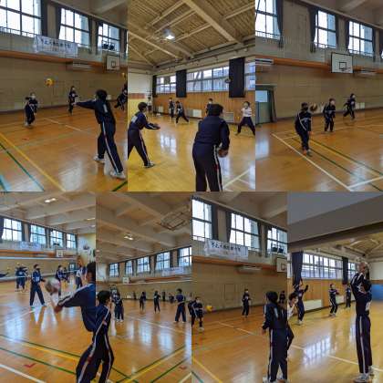 【体育】体育館と格技室に分かれてバレーボールをしています。トスとレシーブの練習をしています。(1、3組)