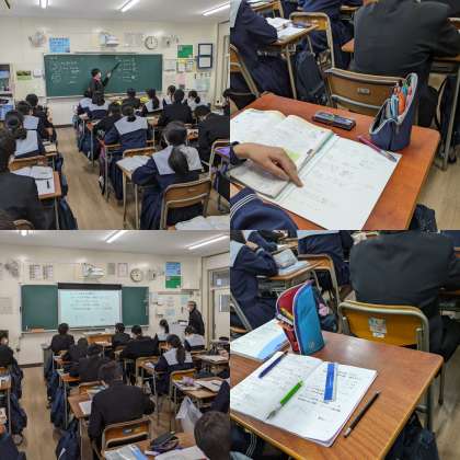 【数学】おうぎ形の問題をしています。辺の長さ、中心角、面積などを求めます。(2組)