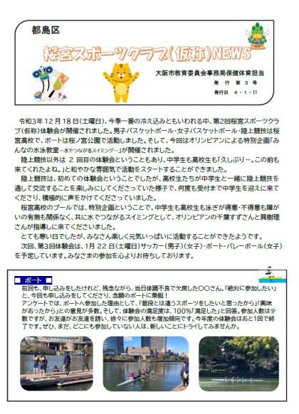 桜宮スポーツクラブ(仮称)NEWS第3号が出ました。詳しくは、ぜひ下の↓ブルーの桜宮スポーツクラブ第3号の所をクリックしてみてください。都島区では先進的な取組が行われています。