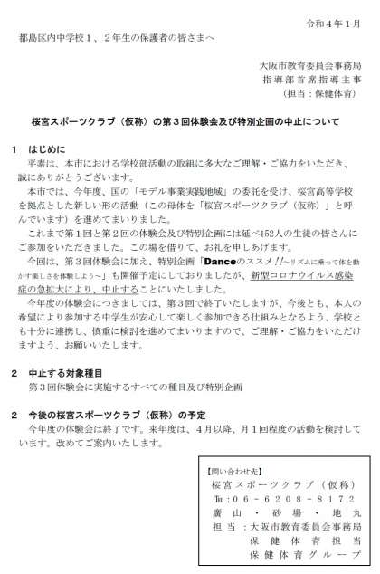 桜宮スポーツクラブ(仮称)第3回体験会中止のお知らせ