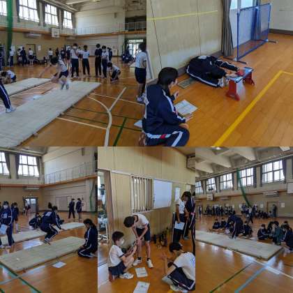 【体育】体力テストを行っています。『立ち幅跳び』『握力』『長座体前屈』の測定です。(1、2組)