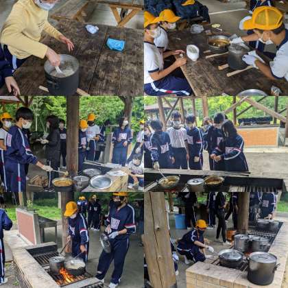 みんなで協力して作ったカレーを取り分けて食べます。