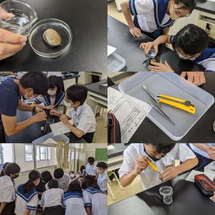 【理科】あさりの観察をします。お湯をかけたり、つまようじ・ピンセット・カッターを駆使して開こうとしますが、貝の力になかなか勝てません。貝柱を切ると開きやすくなります。(2組)