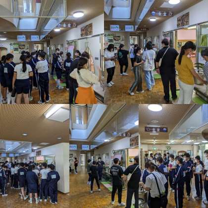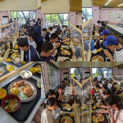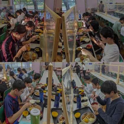 2グループに分けて入浴と食事を順番におこないます。食堂に入る前に給茶をします。