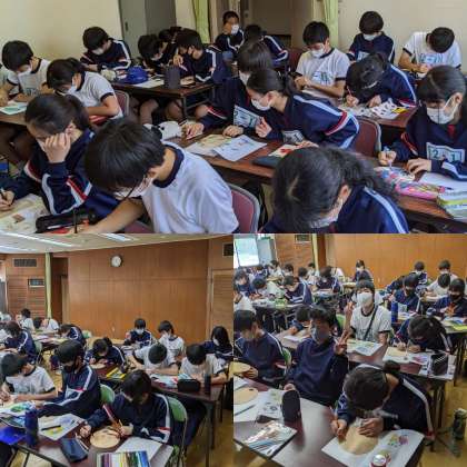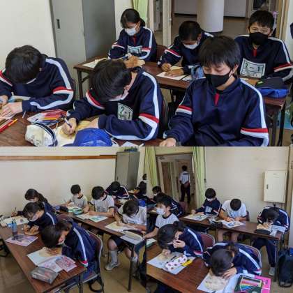 あまりにも外が暑いため涼しい部屋に移動して作品作りの続きをします。部屋に入ると黙々と取り組んでいました。