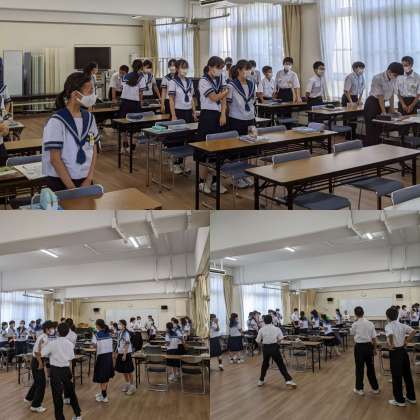 【体育】5時間目の授業の様子です。先生が出題する〇×問題に答えます。しっかり問題を考えて右へ左へと移動して解答します。