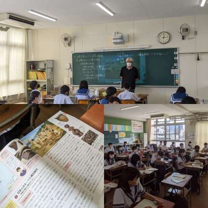 【社会】縄文時代の様子の絵を見てどんなことがわかるか発表します。『狩りをしている』『捨てている』『土器を作っている』『海の近く』『干している』『家がある』色々な答えがありました。(2組)