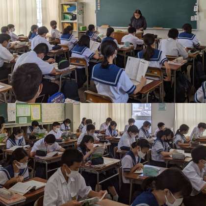 【国語】『字のない葉書』という題材です。音読のテストをしていました。(3組)