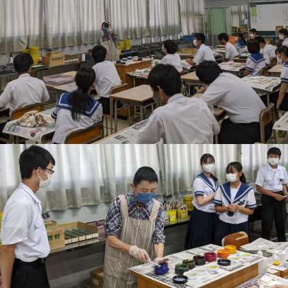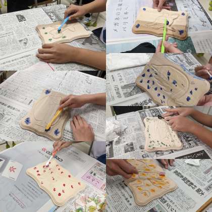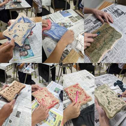 【美術】デザインを考えて彫った木の板に木彫ワックスを塗り込んでいきます。(3組)