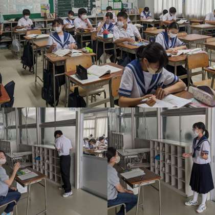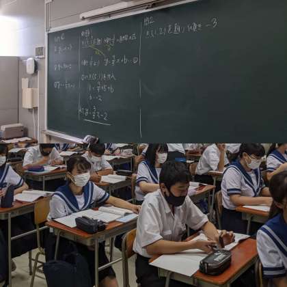 【国語】『枕草子』の暗唱テストをしています。待っている生徒はワークを解いています。(3組)