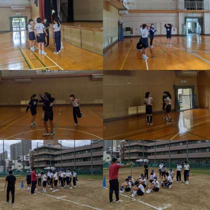 【体育】女子は体育館で創作ダンスを考えています。男子は2グラでスポーツ大会での動き方を聞いていました。(1組)