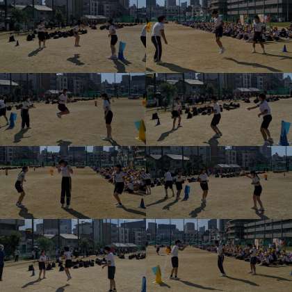 プログラム10番『Winning Jump〜みんなでつなげロープの絆〜』です。本日最後の競技です。3人1組でロープを持って走り、3カ所で縄跳びを指定された回数飛びます。戻って来たロープをクラスみんなでまたぎます。自分に勝ち、新たなステージに進んでいこうという体育委員の願いが込められた競技です。3年間つちかってきた絆をロープに込めてクラス一丸となってつなぎます。生徒の競技の前にエキシビジョンとして先生が走ります。