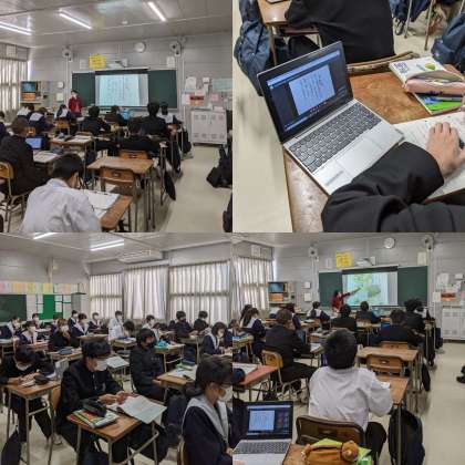 【国語】徒然草について学んでいます。手元のパソコンで黒板に映っている内容を確認することができます。(1組)