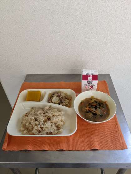 【本日の献立】 豚肉と野菜のいためもの いわしのつみれ汁 かぼちゃういろう かやくご飯 牛乳
