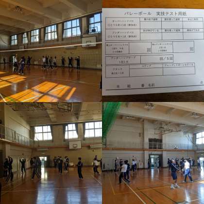 【体育】女子はサッカーです。インフロントキックの練習です。相手の名前を呼んでパスを出します。男子はバレーボールです。直上パスのテスト前の練習をしています。(2,3組)