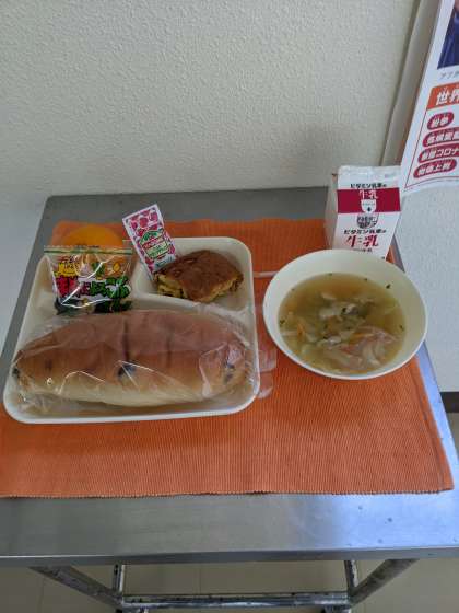【今日の献立】 ツナポテトオムレツ 鶏肉とキャベツのスープ みかん 豆こんぶ パン 牛乳