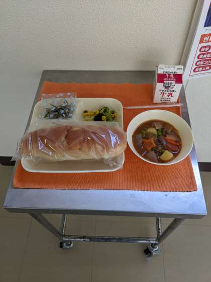 【今日の献立】 ビーフシチュー ブロッコリーとコーンのサラダ ミニフィッシュ パン 牛乳