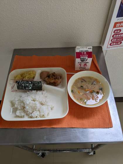 【本日の献立】 鶏肉の甘辛焼き かす汁 くりきんとん 焼きのり ごはん 牛乳