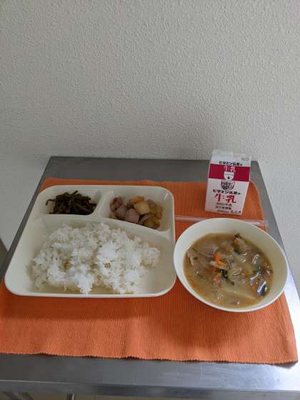【本日の献立】 まぐろの甘辛焼き 豚汁 くきわかめのつくだ煮 ごはん 牛乳