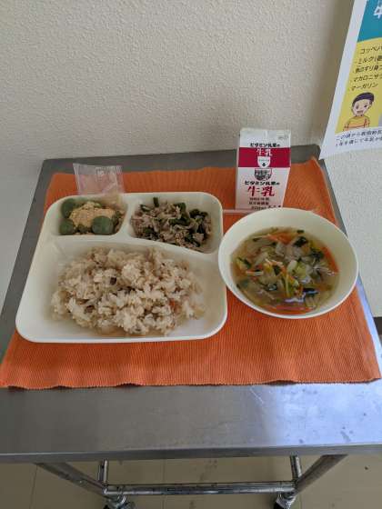 【本日の給食】 豚肉と野菜のいためもの すまし汁 きな粉よもぎだんご かやくご飯 牛乳
