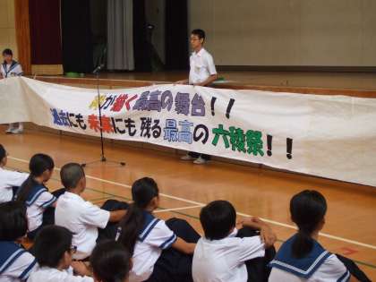 そして生徒会からは、六稜祭(文化祭)のスローガンを書いた横断幕が披露されました。(下の写真)