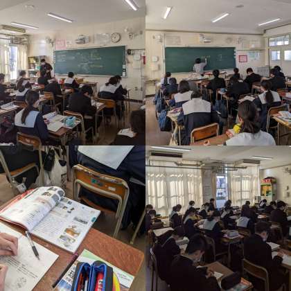 【英語】単語や熟語の説明をしています。先生が発音した後にみんな大きな声で発音します。(1組)