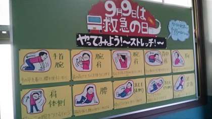 保健室の前の掲示板には救急の日にちなんでストレッチ体操の方法が掲示されています。