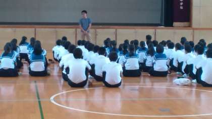 2年生は体育館で職場体験についての学年集会です。