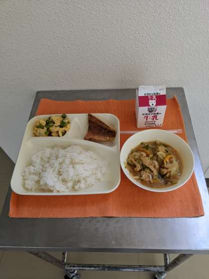 【本日の献立】 あかうおのしょうゆだれかけ みそ汁 えんどうの卵とじ ごはん 牛乳