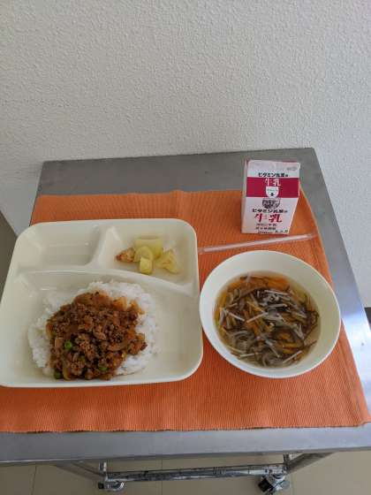 【本日の献立】 タコライス もずくのスープ 焼きじゃが ごはん 牛乳