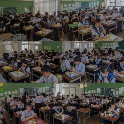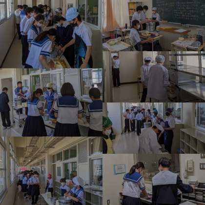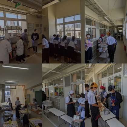みんなで準備をして、おいしく給食をいただきます。放送部の生徒はいつも昼の放送を流してくれます。配膳員さんいつもありがとうございます。