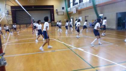 バレーボールの授業ですが授業の最初の補強運動です。小さくステップを踏む練習でバレーボールの動きにも繋がります。簡単そうに見えて結構、難しい・・・・・