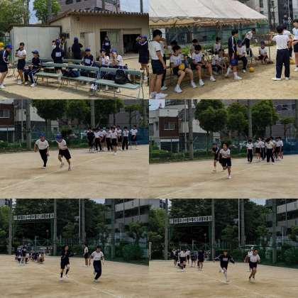 【体育】『ハンドボール投げ』『50m走』の練習をしています。競技の合間に水分をしっかりとって休憩します。(3組)