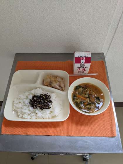 【本日の献立】 鶏肉のおろしじょうゆかけ みそ汁 魚ひじきそぼろ ごhん 牛乳
