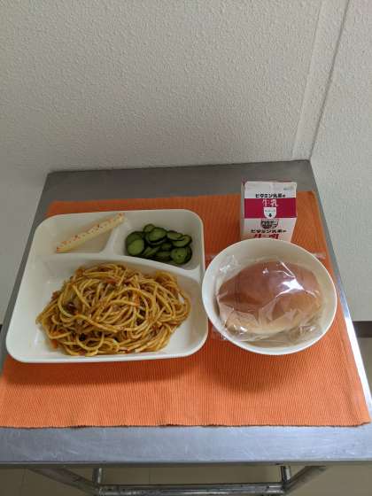 【本日の献立】 カレースパゲッティ きゅうりのピクルス 棒チーズ パン 牛乳