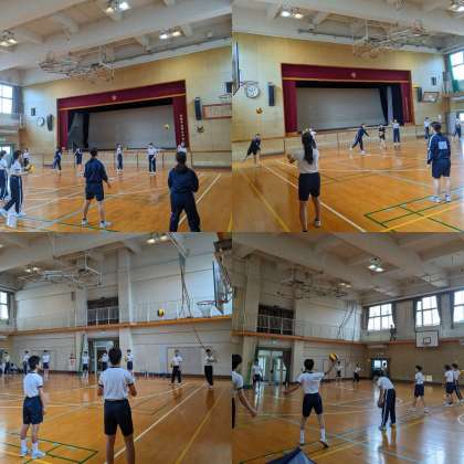 【体育】バレーボールを使ってボールを投げる練習をしています。投げ方のフォームを確認します。(3組)