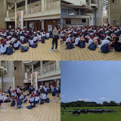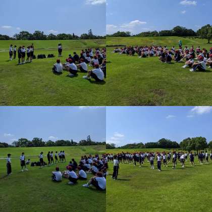 雲一つない青空の下でレク活動をしています。木の陰で休憩しながらおこなっています。