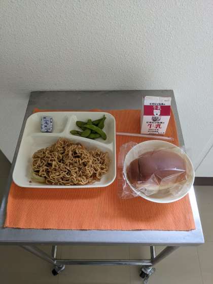 【本日の献立】 オイスターソース焼きそば えだまめ 固形チーズ パン 牛乳