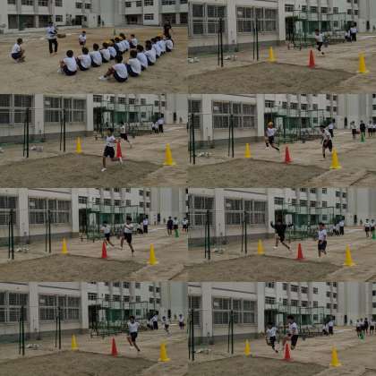 【体育】女子は体育館で、マット運動をする前に動画を見て動きを確認します。男子はグランドで、走り幅跳びの踏み切りの練習をしています。(2、3組)