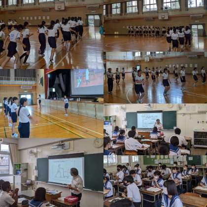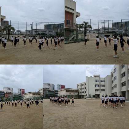 【体育】男女ともに準備運動から始まります。ランニングとラジオ体操をして、しっかり体を動かしてから授業に入ります。(2、3組)
