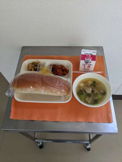 【本日の献立】 ヤンニョムチキン とうふのスープ 切干しだいこんのナムル パン 牛乳