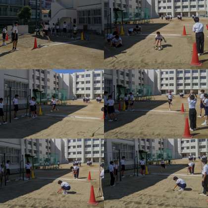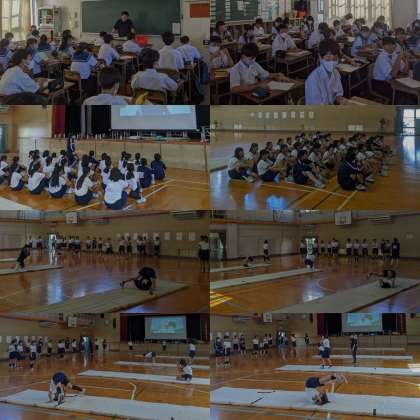 【体育】女子は体育館でマット運動です。開脚後転をしていました。男子は運動場で走り幅跳びの測定をしていました。(2、3組)