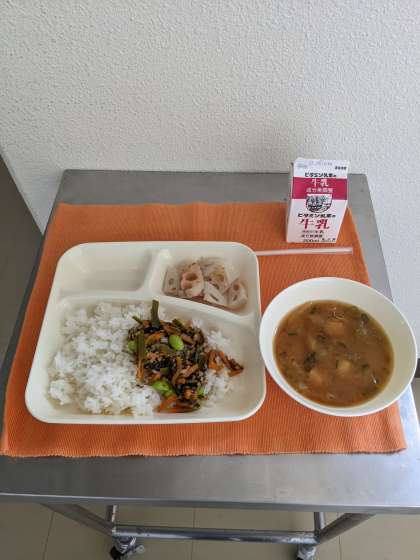 【本日の献立】 もずくと豚ひき肉のジューシー さつまいものみそ汁 焼きれんこん ごはん 牛乳