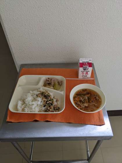【本日の献立】 鶏肉のゆず塩焼き ソーキ汁 ツナ大豆そぼろ ごはん 牛乳