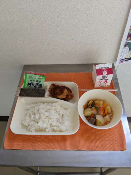 【本日の献立】 みそカツ じゃがいもと野菜の煮もの 焼きのり ソフト黒豆 ごはん 牛乳